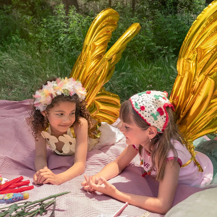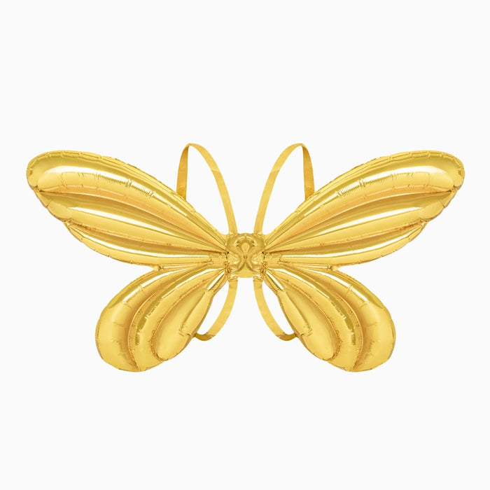 Aripi din balon folie aurii, 84 x 60,5 cm, care nu necesita heliu. Se umfla cu paiul inclus sau cu ventilator (nu este inclus). Perfecte pentru petreceri, costume sau joaca.