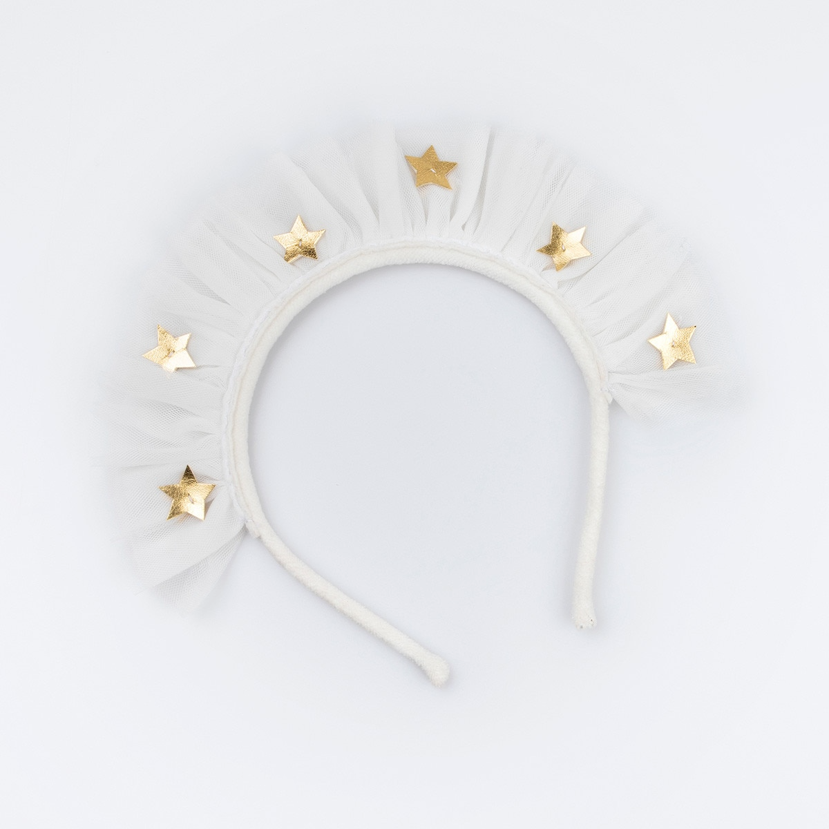 Bentița are un volan din tulle alb cu stele din piele ecologică aurie aplicate