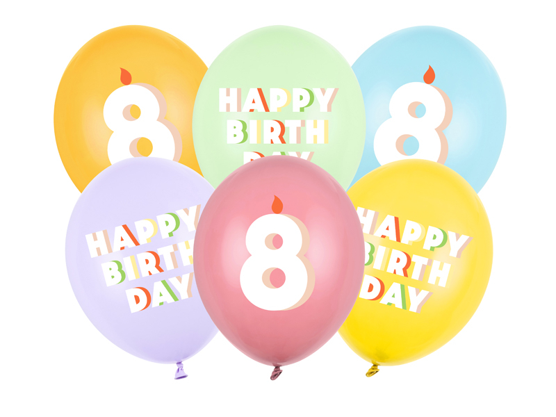 Baloane rezistente in culori pastelate (Pastel Pistachio, Pastel Wild Rose, Pastel Honey Yellow, Pastel Light Blue, Pastel Light Lilac si Pastel Honey), decorate cu cifra „8” imprimata pe ambele fete. Sunt ideale pentru aniversari si petreceri tematice. Diametru aproximativ: 30 cm. Pachetul contine 6 baloane, cate unul din fiecare culoare.