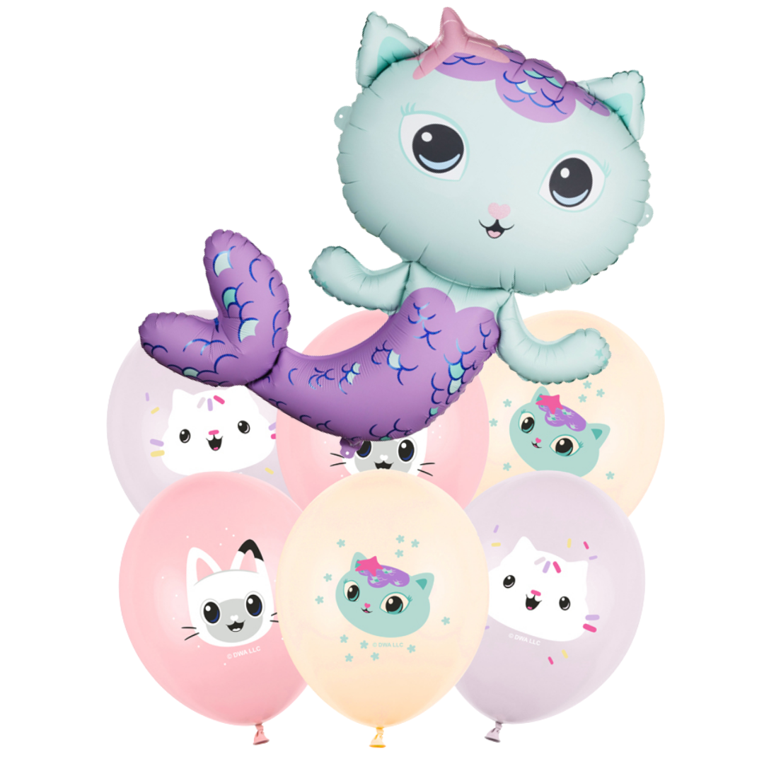 Acest set adorabil de 7 baloane cu heliu, inspirat din universul Gabby’s Dollhouse, este pregătit pentru a aduce culoare și magie oricărei petreceri pentru copii. Toate baloanele sunt umflate cu heliu, legate cu panglică și prinse de o greutate pentru stabilitate și prezentare frumoasă.