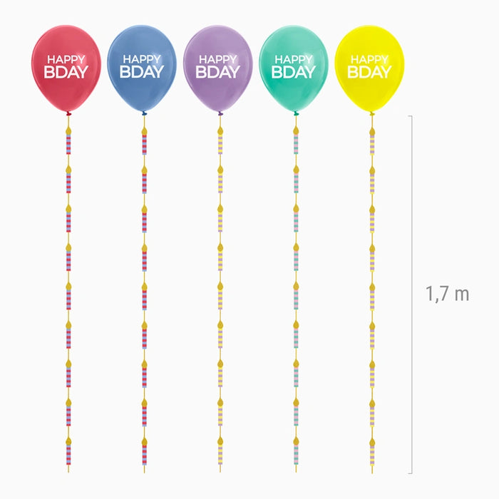 Baloane latex „Happy Bday” (5 buc) 30cm cu siruri colorate cu lumanari, 1.7m