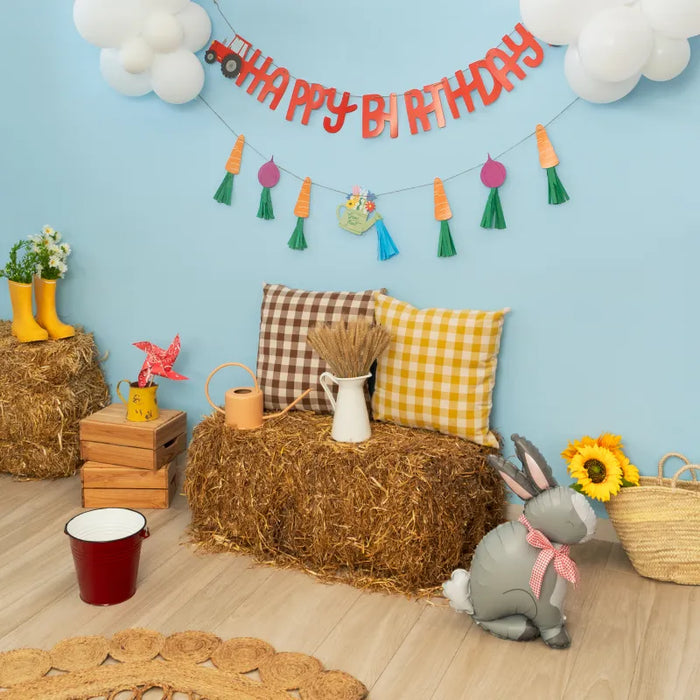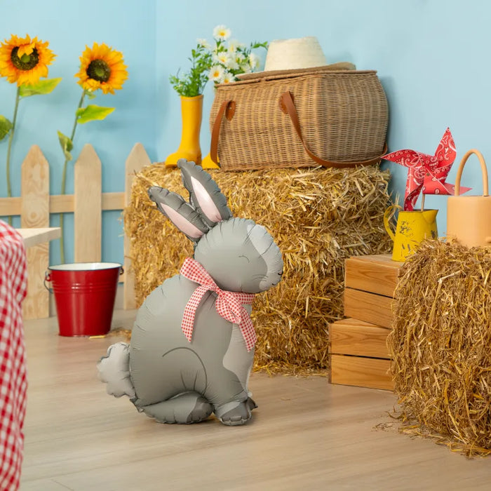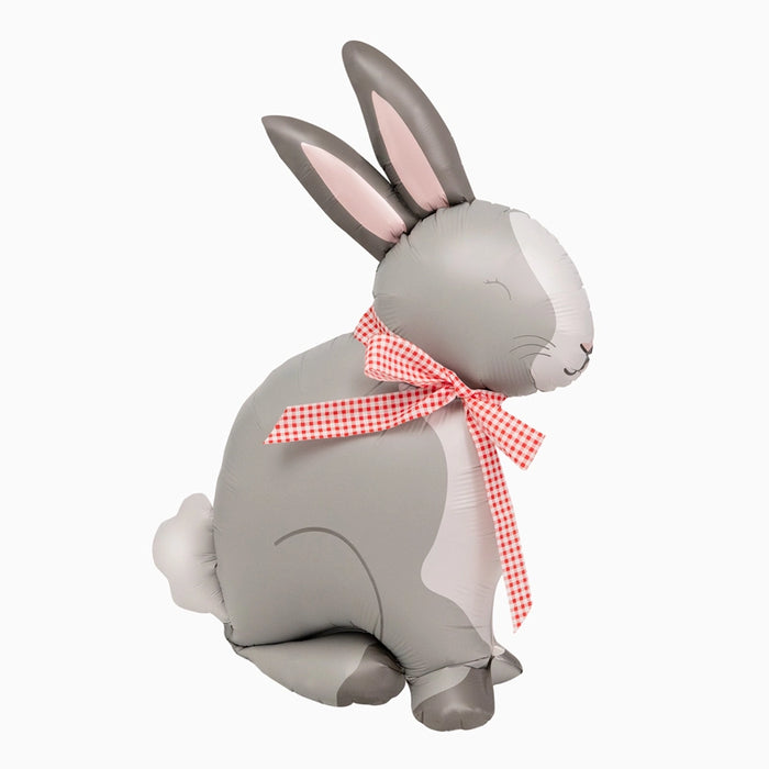 Balon decorativ in forma de iepure 3D, ideal pentru petreceri cu tematica ferma. Se umfla cu aer – nu necesita heliu. Include pai si fundita textila rosie cu carouri.