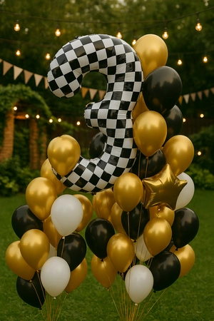 Balon din folie în formă de cifra 3 decorat cu un model în carouri alb-negru, este ideal pentru petreceri tematice, aniversări și evenimente inspirate de curse sau motorsport. Designul modern și contrastant îl face ușor de integrat în diverse decorațiuni cu baloane, adăugând un accent vizual puternic decorului.