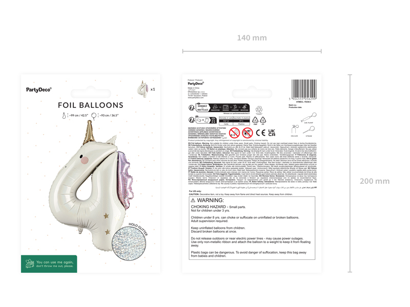 Balon folie Cifră 4 – Unicorn, culoare crem cu efect holografic, decorat cu detalii roz pal și aurii. Dimensiuni înainte de umflare: aprox. 99 cm, iar după umflare: aprox. 93 cm. Se poate umfla cu aer sau heliu. Setul include pai pentru umflare. Balon auto-sigilant.