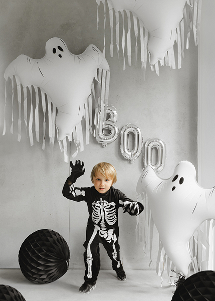 Balon decorativ din folie in forma de fantoma, in culoare crem cu detalii negre si ciucuri decorativi – perfect pentru decoruri de Halloween, petreceri tematice sau colturi foto inedite.