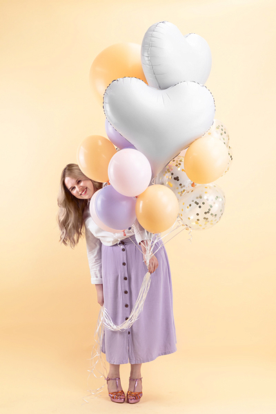 Balon din folie cu finisaj satinat, în formă de inimă, culoare alb. Dimensiuni înainte de umflare: 75 x 64,5 cm (29,5 x 25"). Dimensiuni după umflare: aprox. 61 x 53 cm (24 x 20,5"). Se poate umfla cu aer sau heliu.