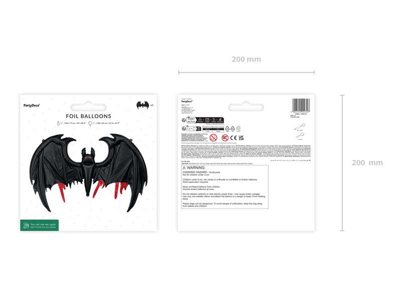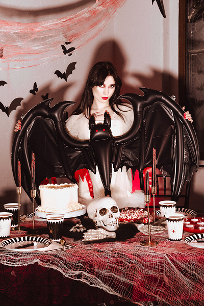 Balon decorativ din folie in forma de liliac, de culoare neagra, cu accente rosii – ideal pentru petreceri de Halloween sau decoruri tematice in stil gotic.
