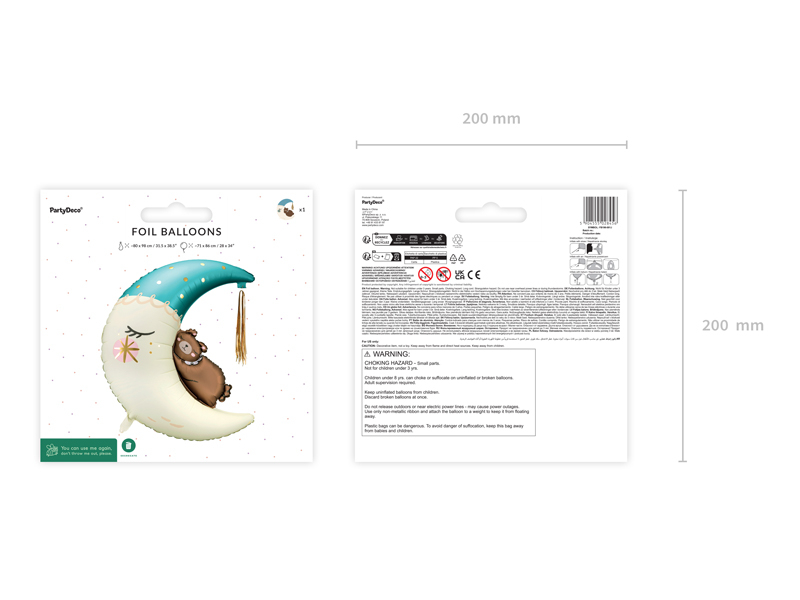 Balon din folie în formă de ursuleț pe lună, cu elemente albastru și ciucure auriu, în culori mixte.