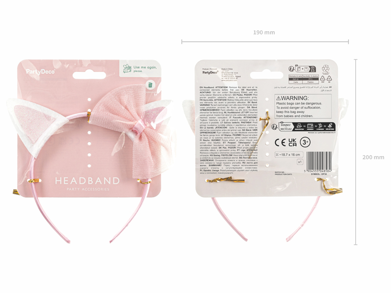 Bentiță cu urechi de pisică și fundiță, în culoare roz, perfectă pentru petreceri tematice, costume sau joacă. Dimensiuni aprox. 18,5 x 17 cm. Confortabilă și ușor de purtat atât de copii, cât și de adulți.
