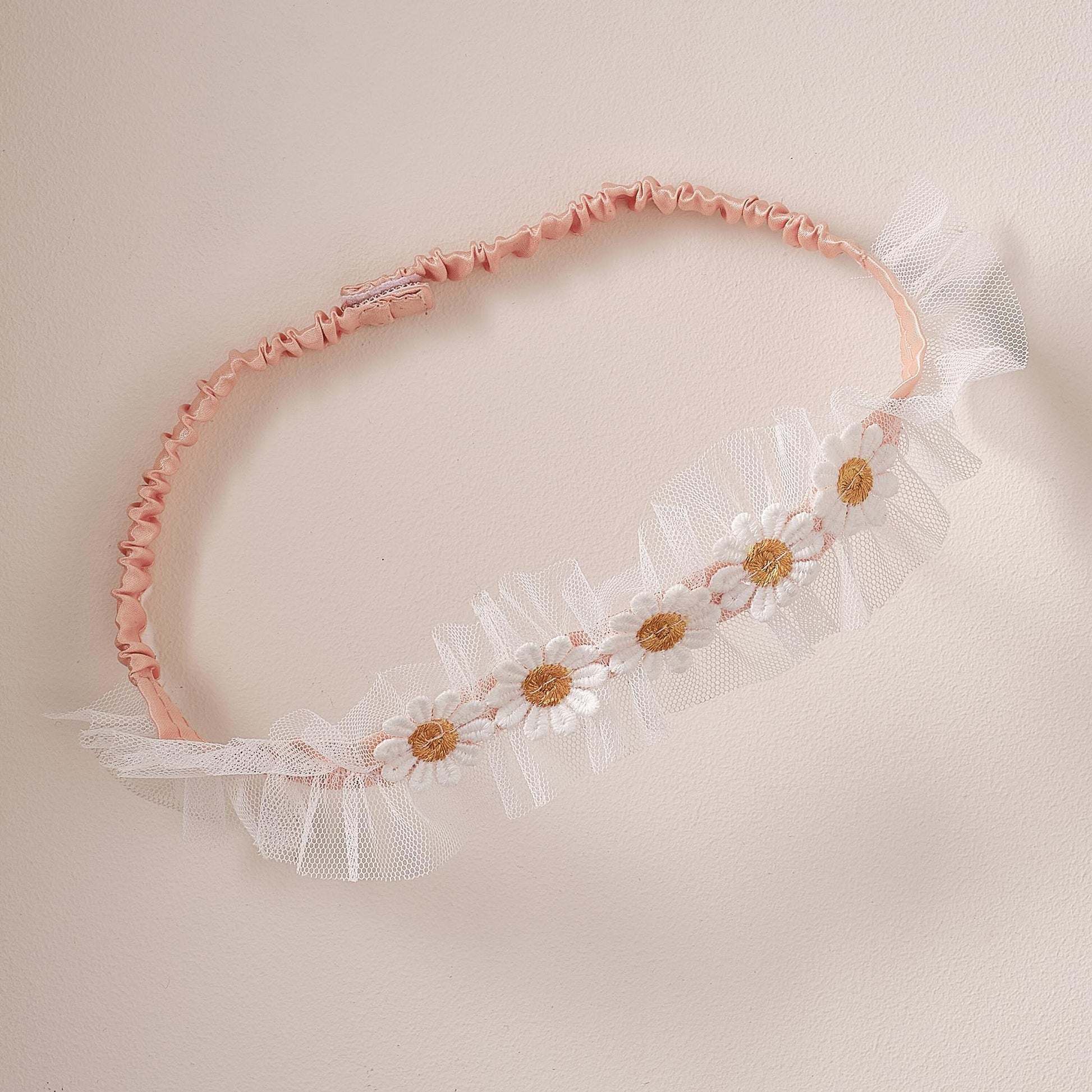 Adauga un strop de farmec cu aceasta bentita delicata, realizata din tull alb si cu detalii brodate de margarete in nuante de roz delicat. Perfecta pentru a adauga o nota florala oricarei tinute, aceasta bentita este usoara si confortabila pentru a fi purtata intreaga zi.