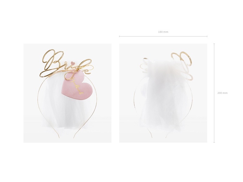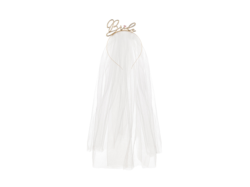 Bentita metalica cu inscriptia „Bride” in culoare aurie si voal alb atasat. Lungime aprox. 50 cm.