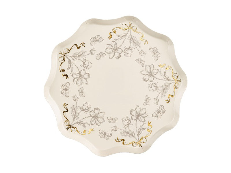 Farfurii din hartie, in nuante de bej, decorate cu flori in tonuri de bej inchis si imprimeu lucios auriu. Diametru aproximativ: 20 cm.