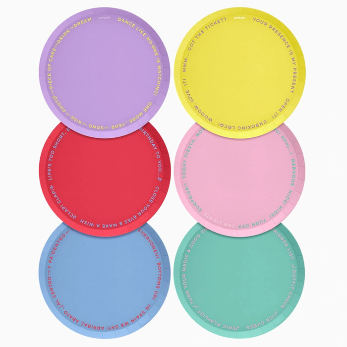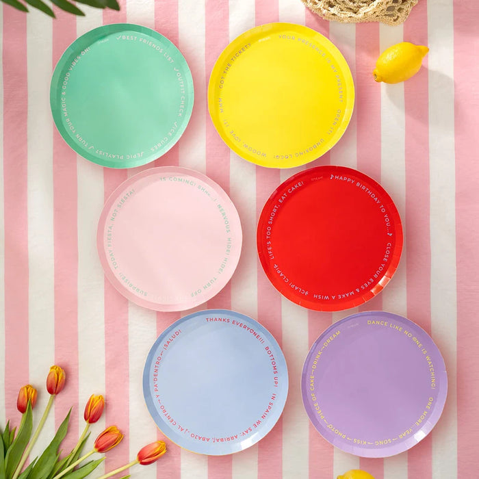 Aceste farfurii din carton colorat fac parte din colectia Happy Vibes, inspirata de stilul italian in dungi si de momentele-cheie ale unei petreceri aniversare:
