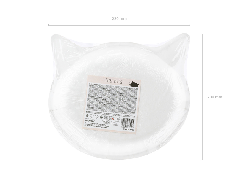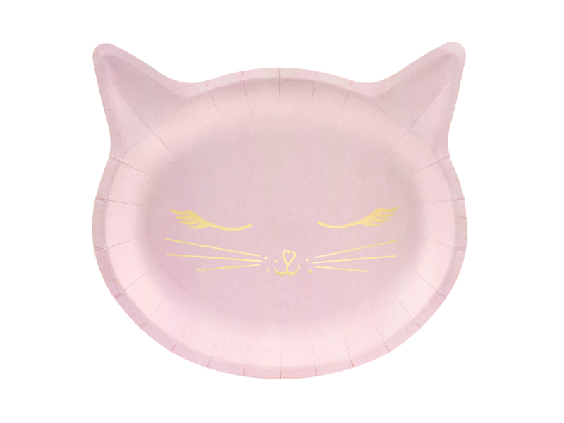 Set de 6 farfurii din hârtie în formă de pisică, de culoare roz, cu detalii aurii elegante.
