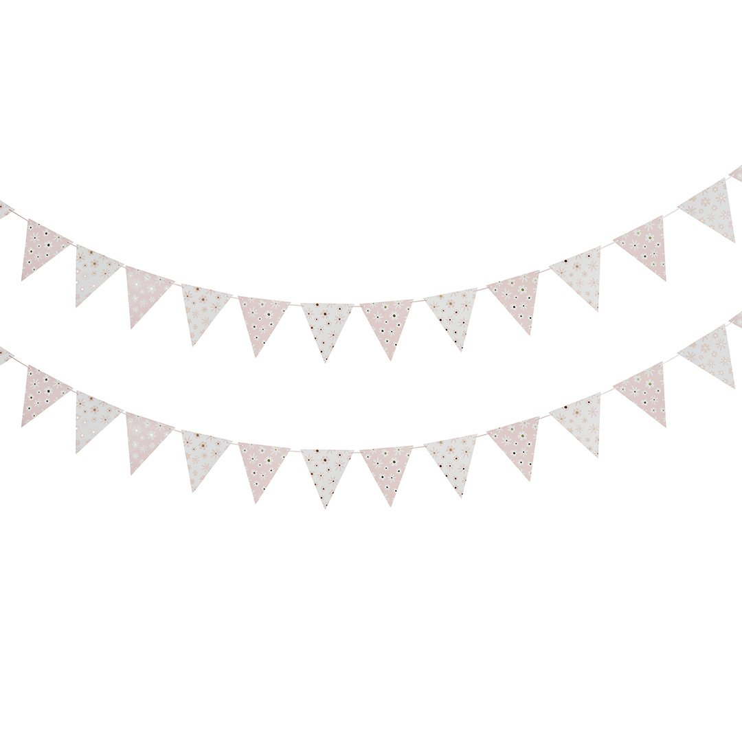 Completeaza petrecerea cu tematica margarete cu aceasta ghirlanda de stegulete roz si alb. Perfecta pentru aniversari, petreceri in gradina si gratare.