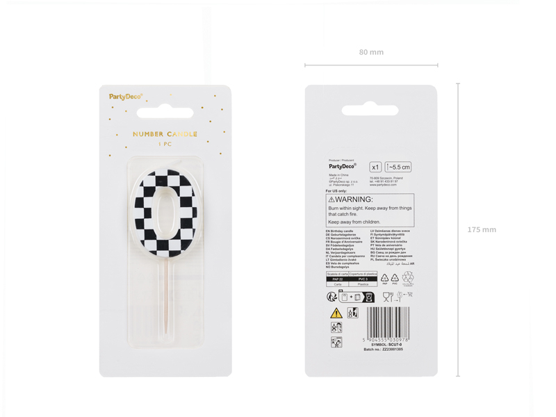 Lumanare aniversara in forma cifrei 0, cu inaltimea de aproximativ 5,5 cm, decorata cu modele mixte, inclusiv model cu steag in carouri.