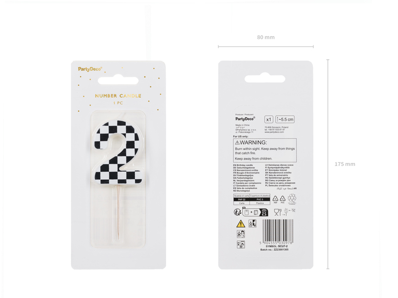 Lumanare aniversara in forma cifrei 2, cu inaltimea de aproximativ 5,5 cm, decorata cu modele mixte, inclusiv model cu steag in carouri.