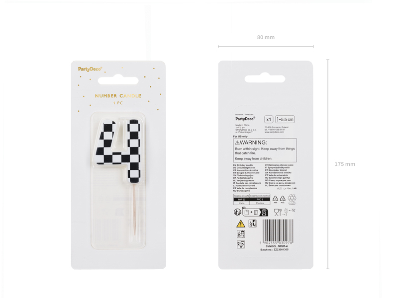 Lumanare aniversara in forma cifrei 4, cu inaltimea de aproximativ 5,5 cm, decorata cu modele mixte, inclusiv model cu steag in carouri.