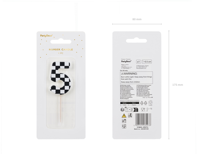 Lumanare aniversara in forma cifrei 5, cu inaltimea de aproximativ 5,5 cm, decorata cu modele mixte, inclusiv model cu steag in carouri.
