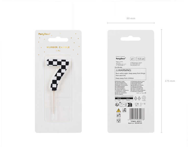 Lumanare aniversara in forma cifrei 7, cu inaltimea de aproximativ 5,5 cm, decorata cu modele mixte, inclusiv model cu steag in carouri.
