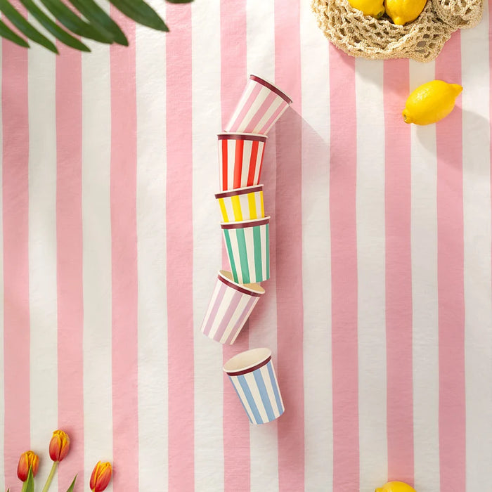 Acest set de 6 pahare din hartie (270 ml) are un design original cu dungi in culori diferite ale curcubeului – fiecare pahar are un model unic: dungi galbene, verzi, albastre, roz etc. Sunt ideale pentru toasturi si decoruri pline de culoare.