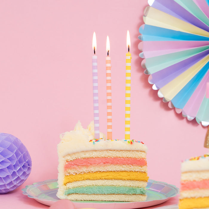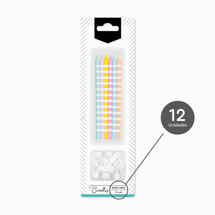 Aceste 12 lumanari lungi in culori pastel cu dungi albe, cu o inaltime de 14,5 cm, sunt ideale pentru torturi de aniversare si alte momente speciale. Designul lor vesel si elegant adauga un plus de farmec oricarei petreceri.
