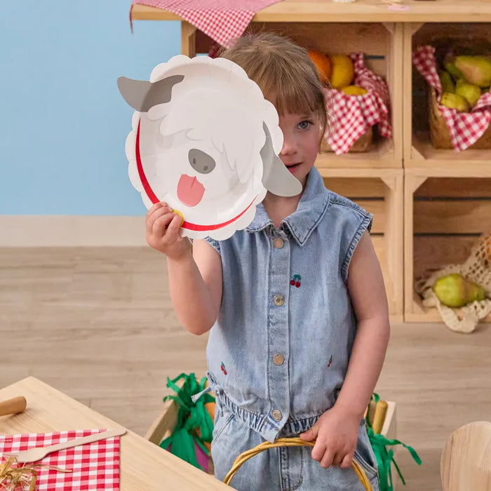 Set de 6 farfurii rotunde din carton certificat FSC, cu diametrul de 22,5 cm, decorate cu modele asortate de oaie, caine si gaina.