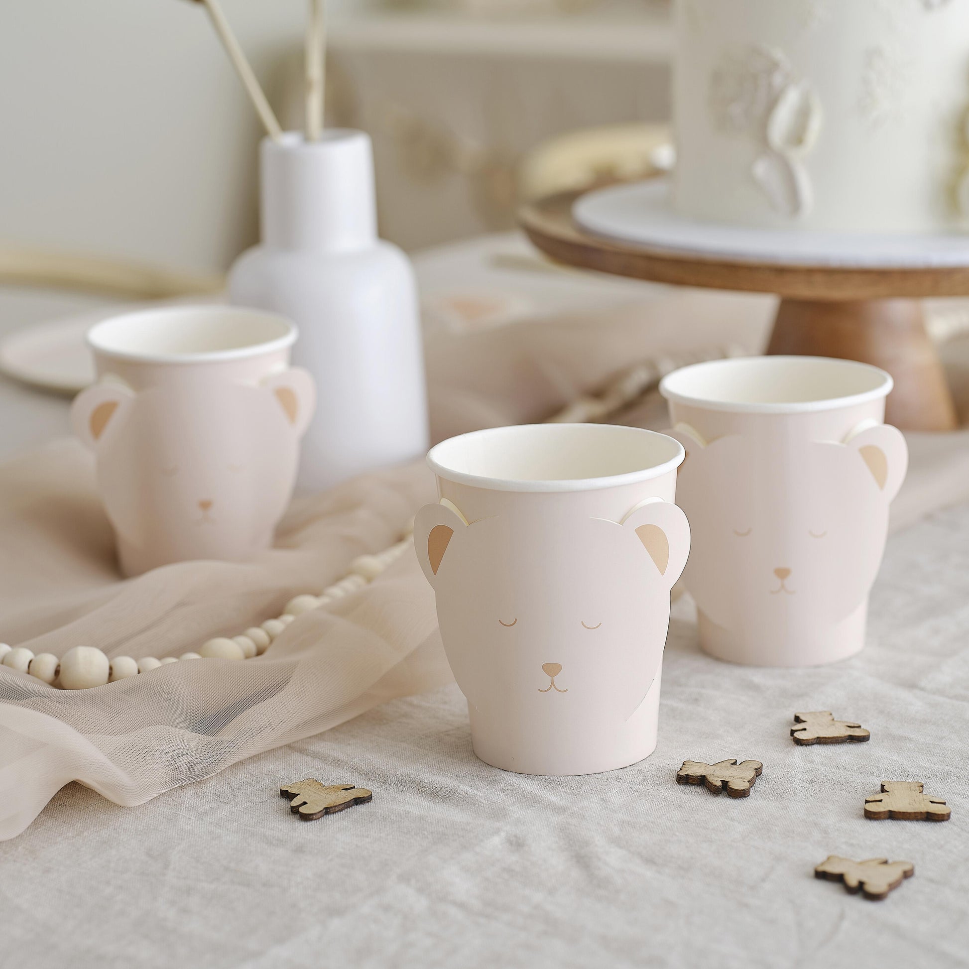 - 8 x Pahare din hartie pentru baby shower cu ursulet si detalii de urechi pop-out