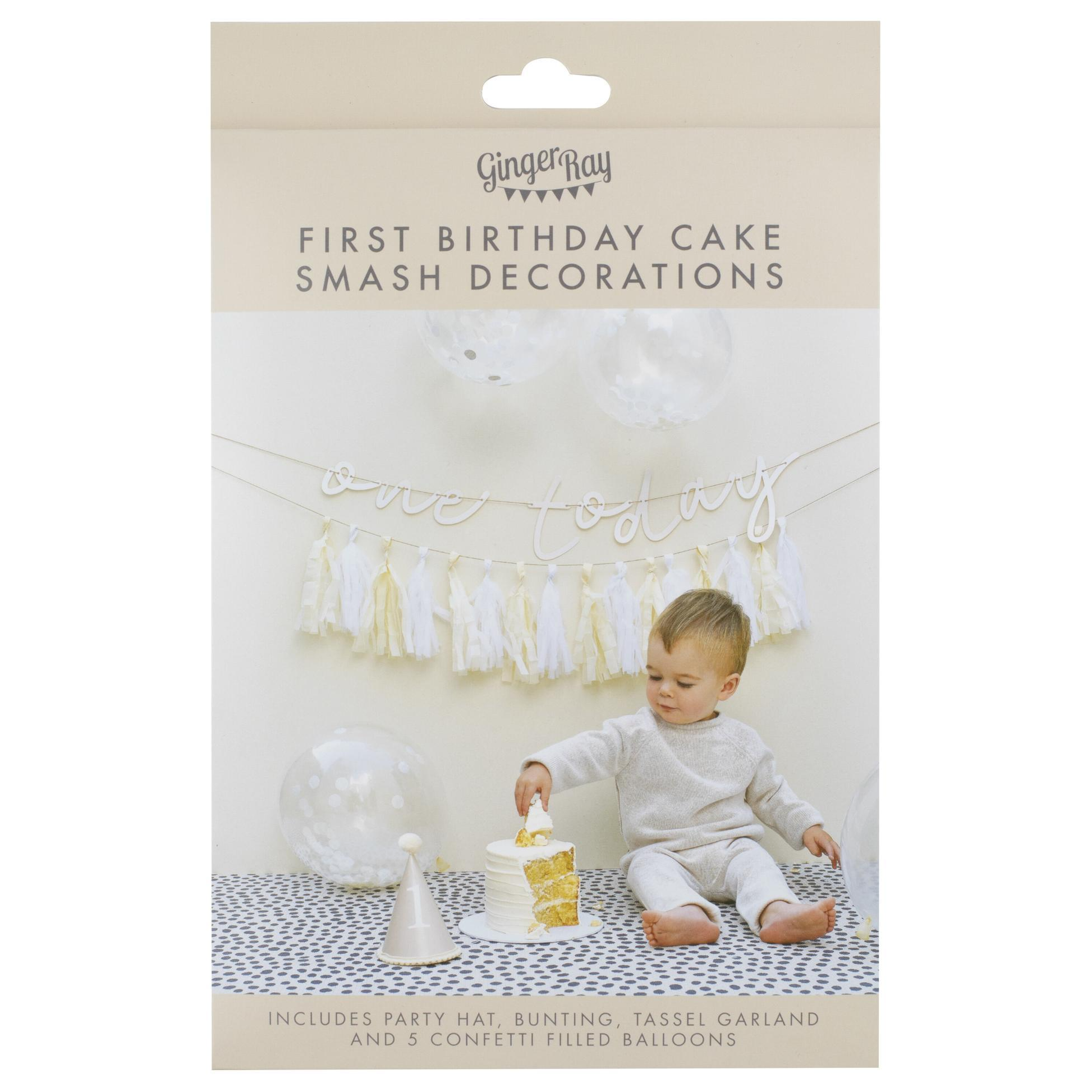 Set aniversar 1 an, Ginger Ray, 5 baloane confetti, banner 'One Today', banner franjuri, coif, Alb & Bej