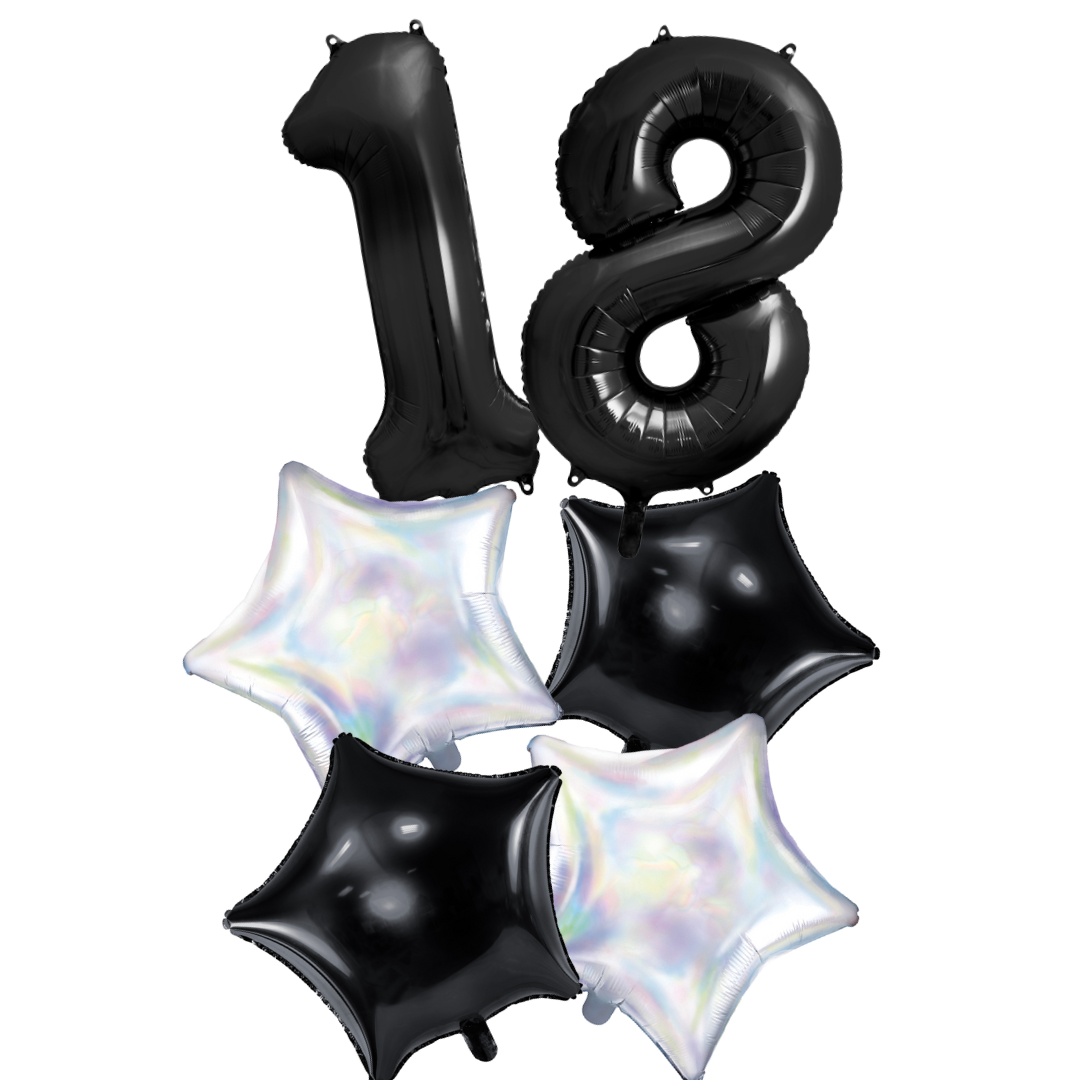 Setul este ideal pentru decorul unei petreceri de majorat / 18 ani, combinând cifre elegante cu baloane în formă de stea care vor adăuga un efect festiv și sofisticat la eveniment