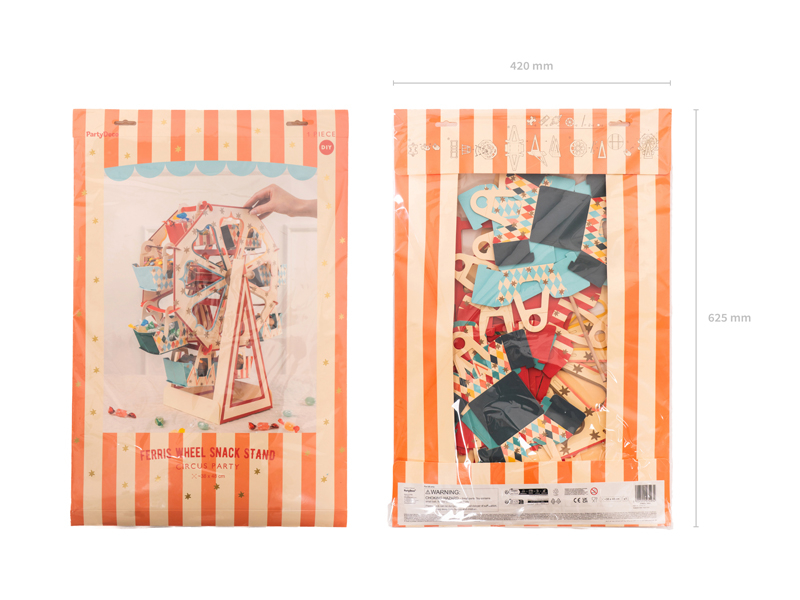 Suport pentru gustari in forma de roata panoramica, cu tematica de circ, confectionat din carton rezistent – perfect pentru petreceri vesele si colorate. Include 8 cabine pentru gustari, fiind un element decorativ si practic in acelasi timp. Se monteaza usor de catre utilizator.