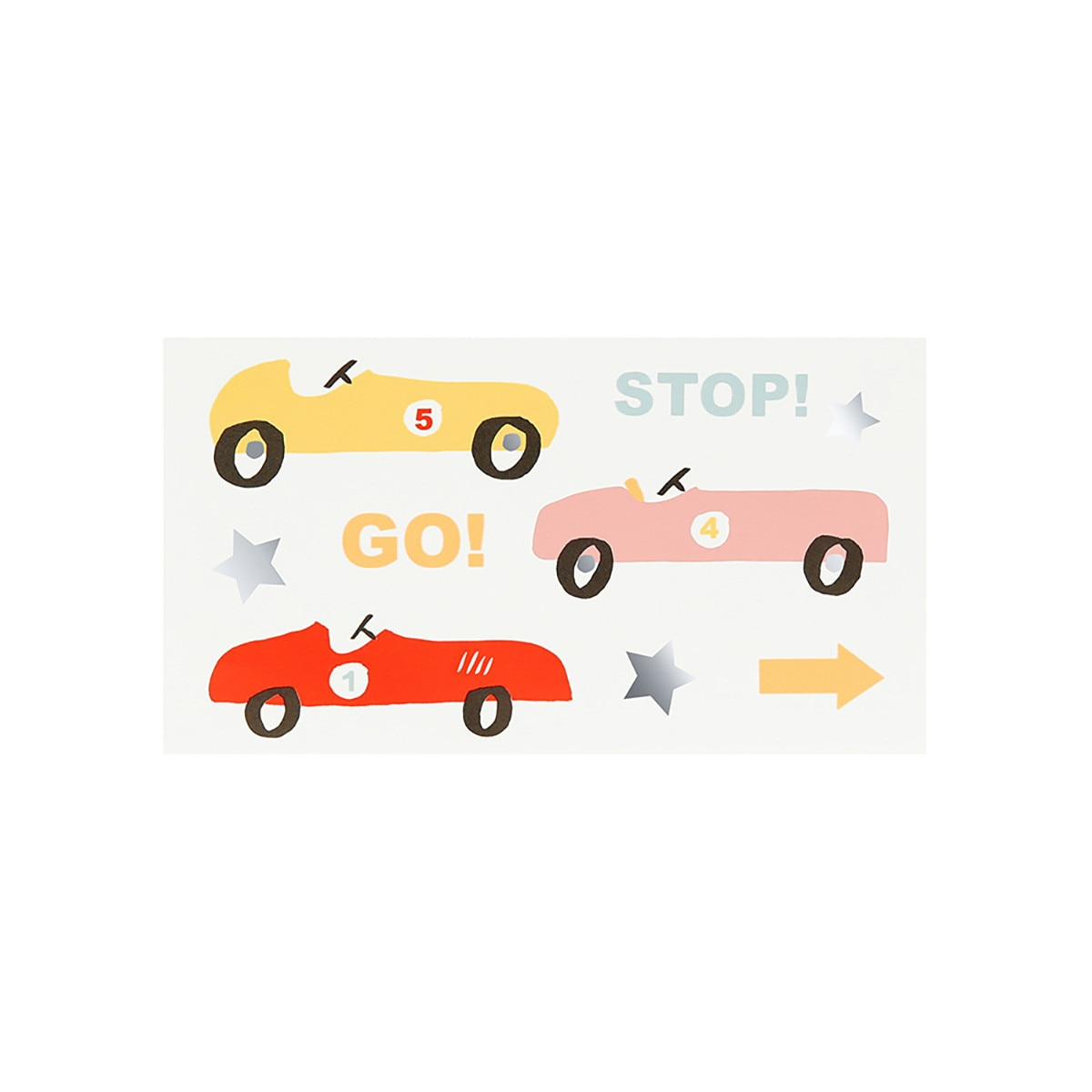 Pregătiți, start, jos! Aceste tatuaje temporare cu mașini de curse sunt perfecte pentru o activitate la petrecere, pentru a fi adăugate în pungi cu cadouri sau pentru distracție într-o zi ploioasă. Culorile vii și detaliile strălucitoare din folie argintie arată spectaculos.